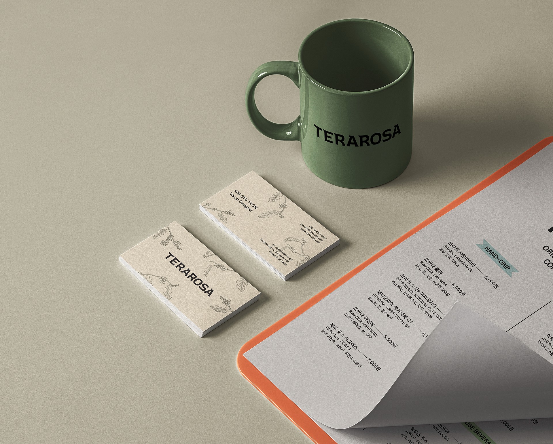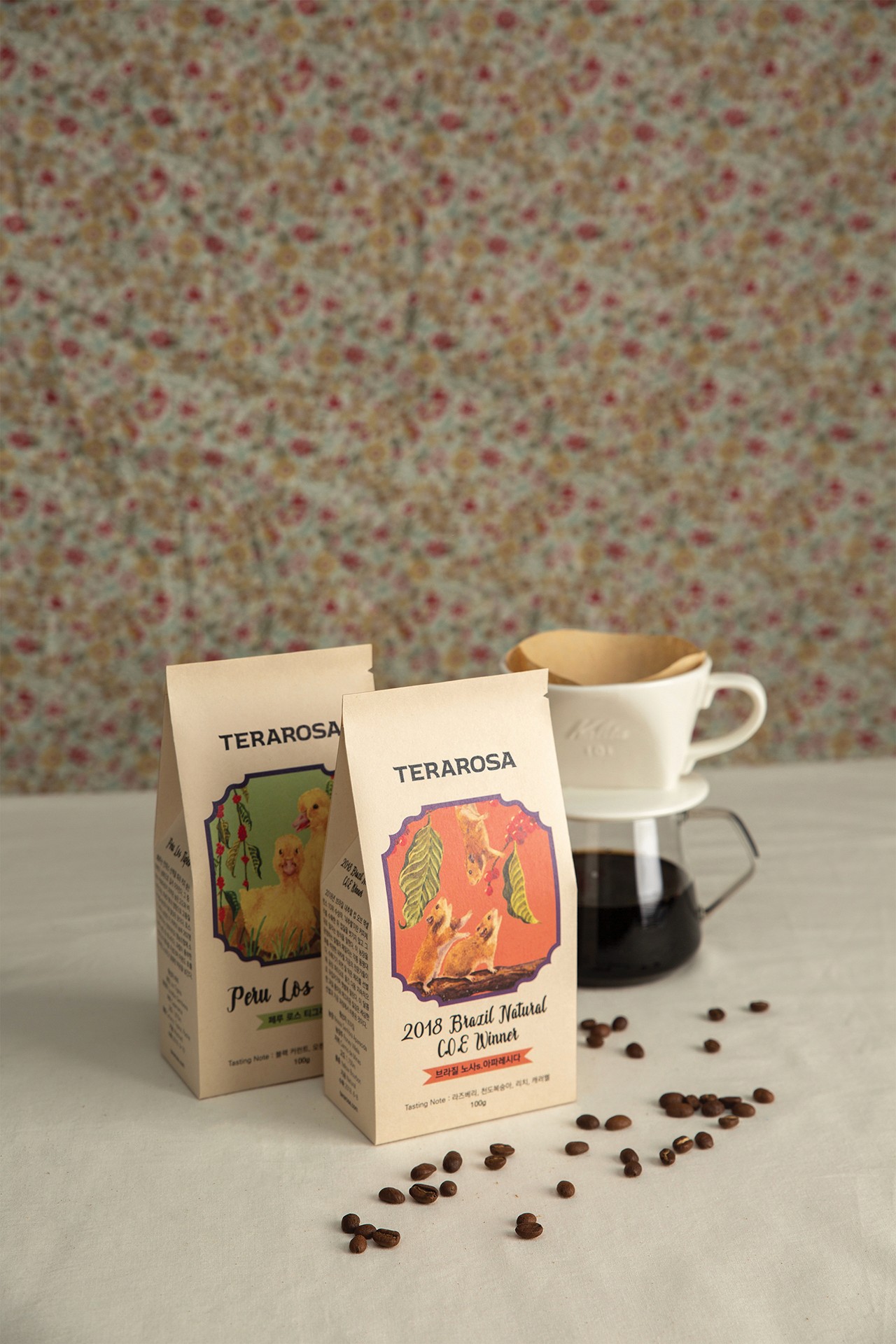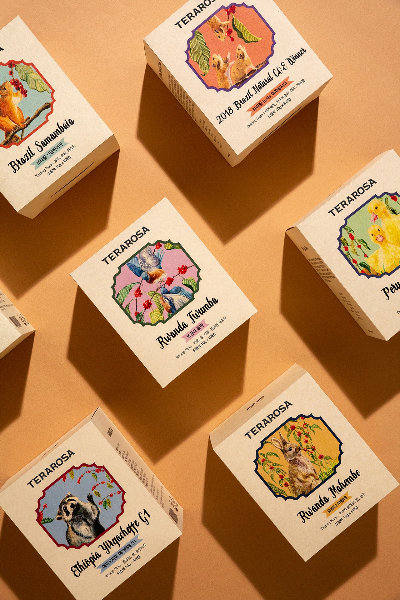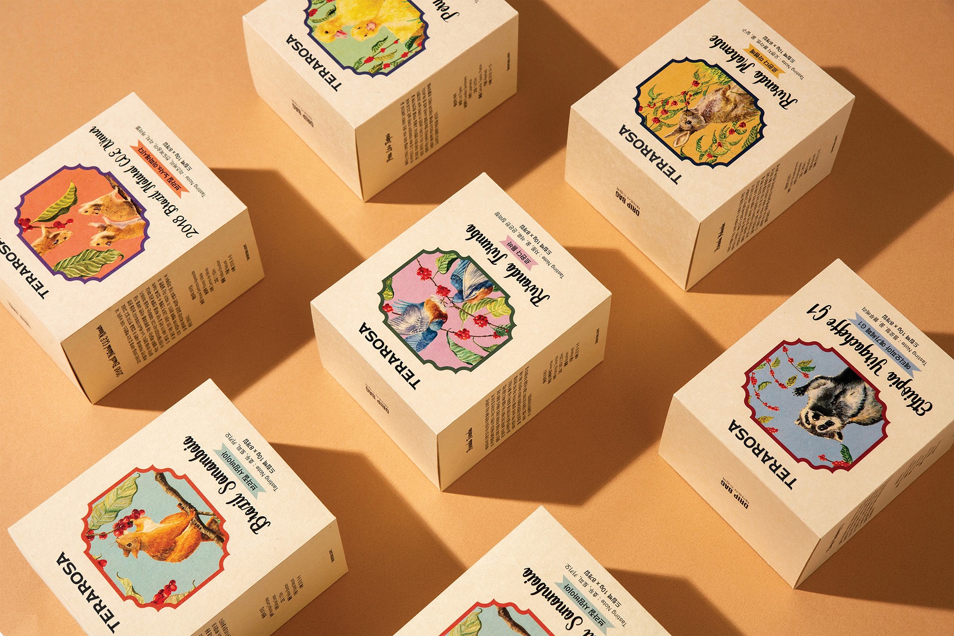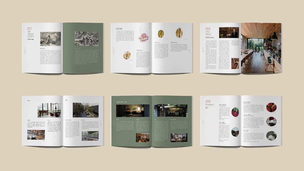 대학교 졸업 프로젝트로 진행하였던 국내 스페셜티 커피 전문점 테라로사의 리브랜딩 작업입니다. 빈티지하고 앤티크한 콘셉트로 재해석해 디자인하였습니다. 숲속에 사는 작은 동물들이 커피체리를 따 먹고 있는 이미지를 수채화로 일러스트레이션 작업을 하였으며, 이는 동화적이고 빈티지한 느낌을 더욱 풍부하게 표현해줍니다.